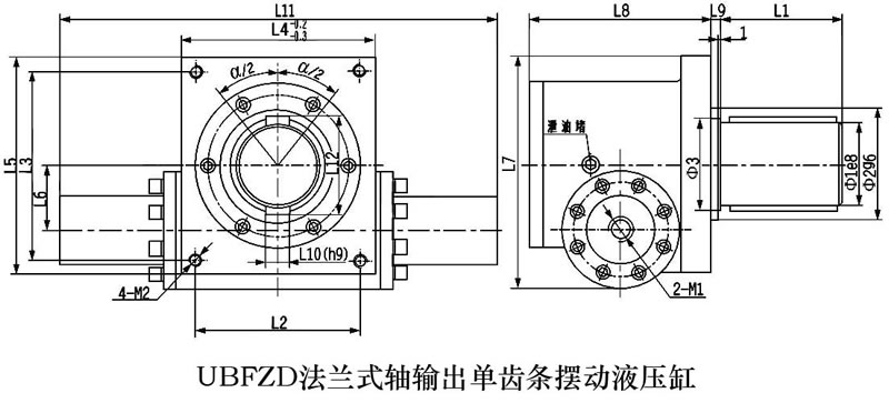 齿轮齿条摆动液压 缸外形安装连接尺寸(UBFZS法兰式轴输出双齿条摆动液压油缸)