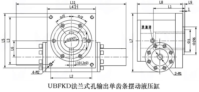齿轮齿条摆动油缸外形安装连接尺寸(UBFKD法兰式孔输出单齿条摆动液压缸)