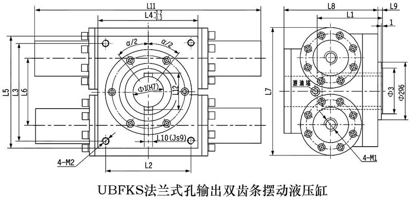 齿轮齿条摆动液压油缸外形安装连接尺寸(UBFKS法兰式孔输出双齿条摆动油缸)