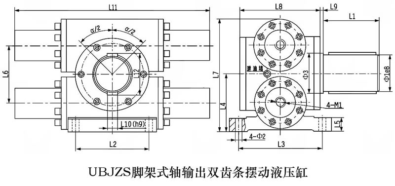 齿轮齿条摆动液压 缸外形安装连接尺寸(UBJZD脚架式轴输出单齿条摆动缸)