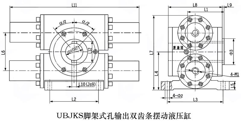 齿轮齿条摆动液压 缸外形安装连接尺寸(UBJKS脚架式孔输出双齿条旋转油缸)