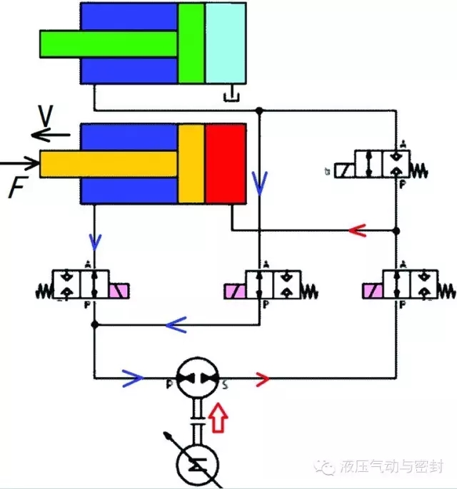 这次回国之前,在杂志上看到力士乐新提出一个回路(图16):用两个差动缸组成了闭式回路,四个二位二通阀,轮流开通,也可以完成所有工况。所谓液压缸的闭合回路,就是在里面循环的油不再直接和空气接触了,这样可以避免油液被氧化,也可以避免带入气泡。我后来仔细分析了一下,确实可动作,就是这些阀轮流开启,甚至还可以回收能量。