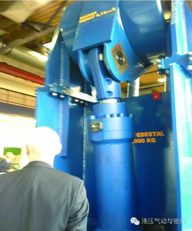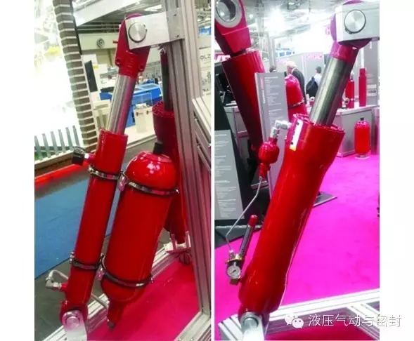 汉斯(HAINZL)公司展出的电液作动器使用了两个活塞式蓄能器。液压缸比较大,可能出力也相当高。