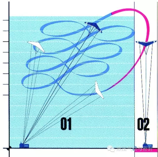 最后还要提一下利用风筝发电,这次汉诺威展会上有一个公司在介绍。其实,越高的地方风越大,这就是为什么现在风力发电机要拼命造得高。但是从地面上造,越往上越不容易造。现在2MW的水平轴发电机,已经要达到150米左右的高度,光是安装费用就要好几百万元。而用风筝就很容易到3、5百米的高空。这个公司说:他们20kW的样机去年已经试验成功了,今年正在准备200kW的样机。他们的风筝不是普通的风筝,是由空气动力学家特殊设计的,像飞机翅膀,飞行姿态是可控的。通过改变角度可以像图19所示那样:从收回的状态逐步放出去。通过控制,让这风筝走8字形。就在这过程中把钢缆不断往外拉,从而带动发电机发电。到钢缆全部拉完以后,再控制它快速下降,降到低处后再开始这么走8字形。大概就是这么个过程:不用的时候停在低处,然后开始转圈,一点点上去,到最高了,哗一下下来,然后再重复。这也是一个很好的创新。