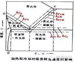 其中,基本的就是A3线(GS线,也就是铁奥区与奥氏体区的交界线),Acm线(ES线,渗奥区与奥氏体区德交界线),A1线(PSK线,珠光体开始转变线)。此外,“c"表示加热,"r"表示冷却。因此,虽然A1,Ac1,Ar1本质上说的是一回事,但是因为热滞、冷滞现象,实际转变温度较A1线有上下波动。