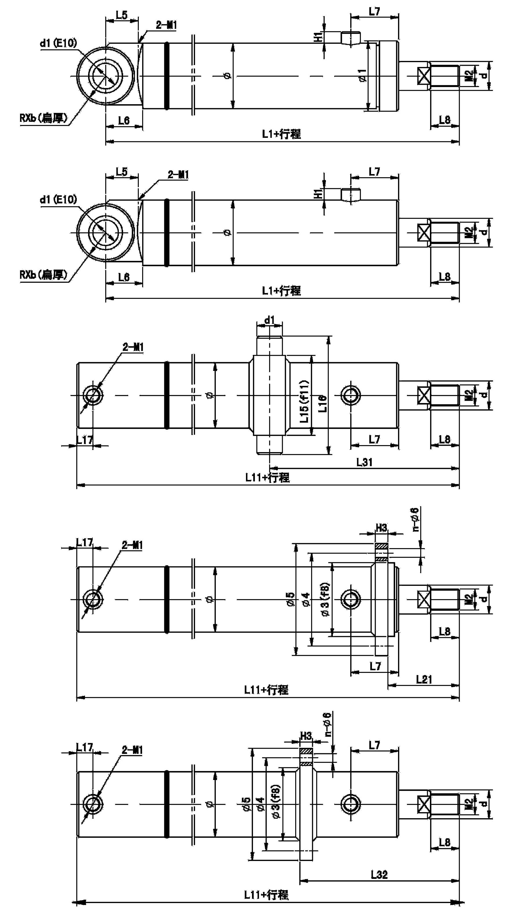 活塞杆端为内螺纹杆头耳环连接的油缸外形安装尺寸表(铰轴、端部、中部法兰)