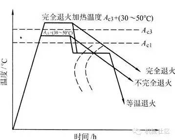 不完全退火加热后,保温时间应稍长,因为保温温度低,扩散转变速度慢。而冷却时,通过Ar1时也应特别缓慢,以保证渗碳体的球化。因此也成球化退火。对于一些一次球化难以达到目的的钢,可采用循环退火法。