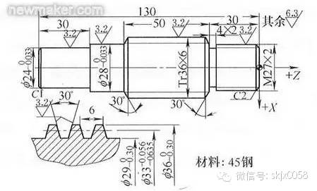 下面以加工梯形螺纹Tr36×6为例,介绍如何在CST980T系统的数控车床上变速车削梯形螺纹。车削的梯形螺纹工件如图1所示。